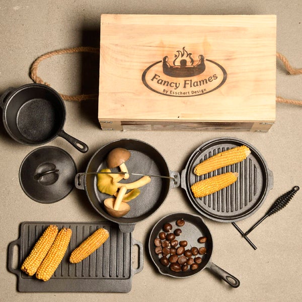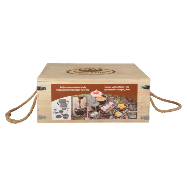 Gotowanie na świeżym powietrzu to przeżycie i przygoda. Przygotuj najsmaczniejsze posiłki z tym kompletnym 7-częściowym zestawem, składającym się z garnka na ognisko, patelni z dziobkiem, dwustronnego grilla z uchwytami, rondla z pokrywką i uchwytem. Wszystkie części są zapakowane w drewnianą skrzynię z uchwytami ze sznurka, co ułatwia zabranie jej ze sobą, w skrzyni jest też wystarczająco dużo miejsca na dodatkowe przybory kuchenne.
