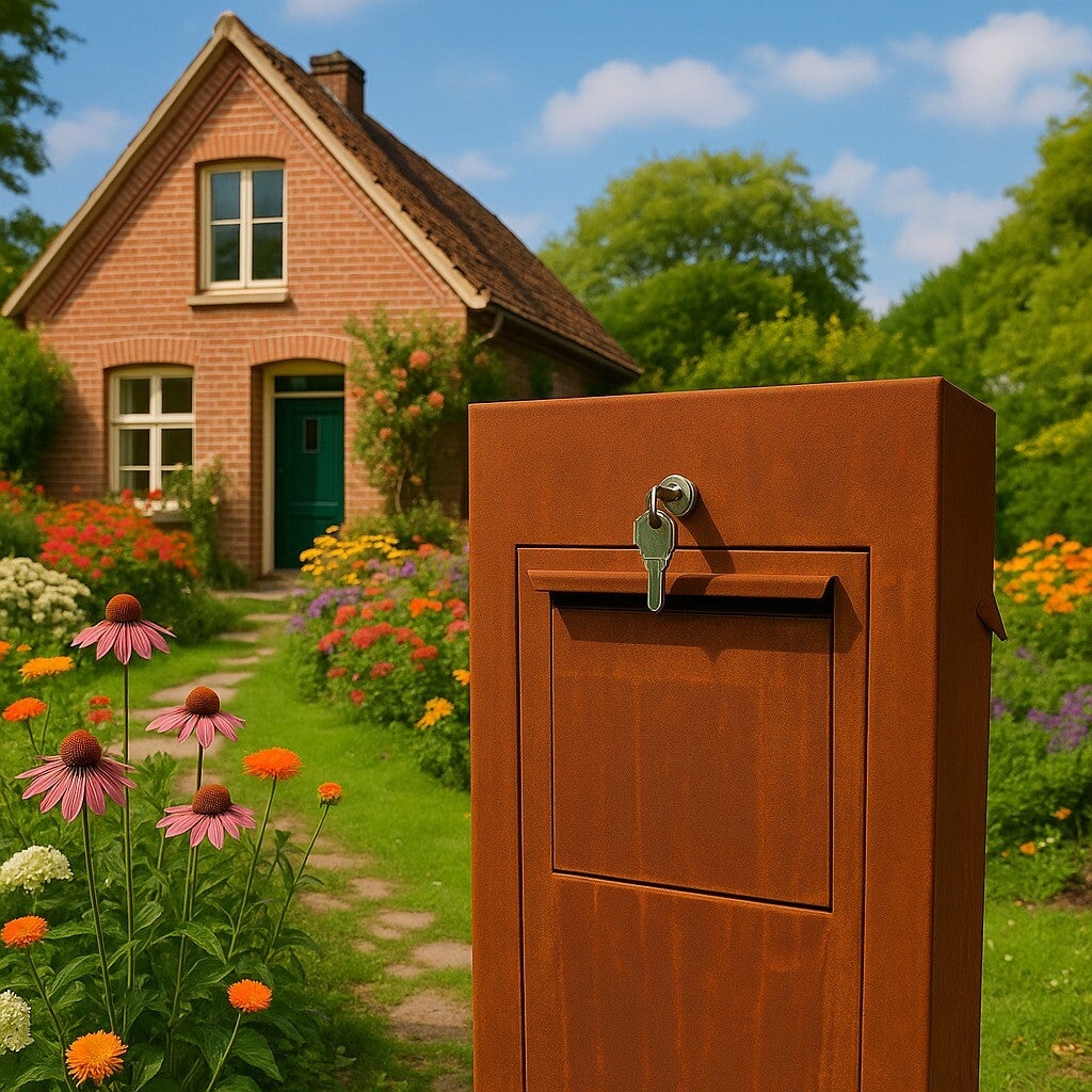Skrzyna na listy wykonana ze stali corten jest trwała i nie wymaga konserwacji, ponieważ pojawiająca się z czasem rdzawa patyna stanowi jednocześnie warstwę ochronną.